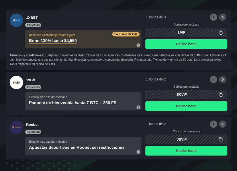 Caliente es perfecto para el público mexicano que quiere apostar en tenis. Cubre todos los torneos importantes y ofrece apuestas en vivo, hándicaps y totales. Con nuestro código de cupón Caliente, obtienes un bono exclusivo al registrarte y realizar tu primer depósito.